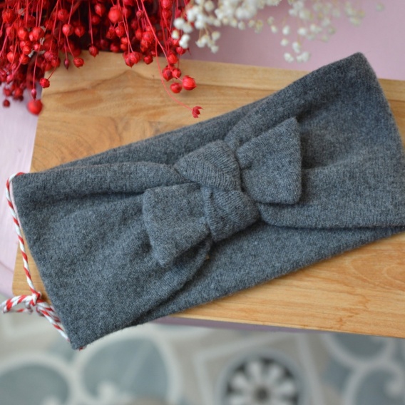 • Grafit z kokardką wełna jagnięca opaska upcykling bardzo ciepła